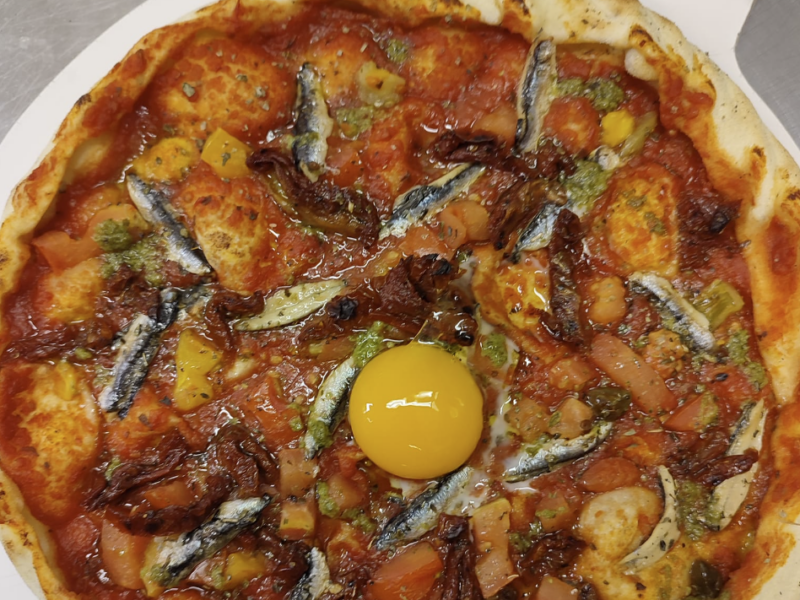 Rome 14.50€ Rome 14.50€Sauce Tomate, Fromage, Olive, Tomate Séchées, Mozza, Persillade, Anchois, Œuf,